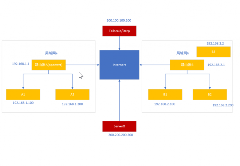 更好的方案是我们去B网络中找一台不关机的设备B3,让他加入虚拟局域网,然后让他声明advertise-route=192.168.2.0/24。