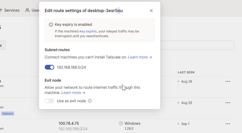 tailscale up --advertise-exit-node去tailscale的后台,许可这台设备作为exit节点,勾选exit node。