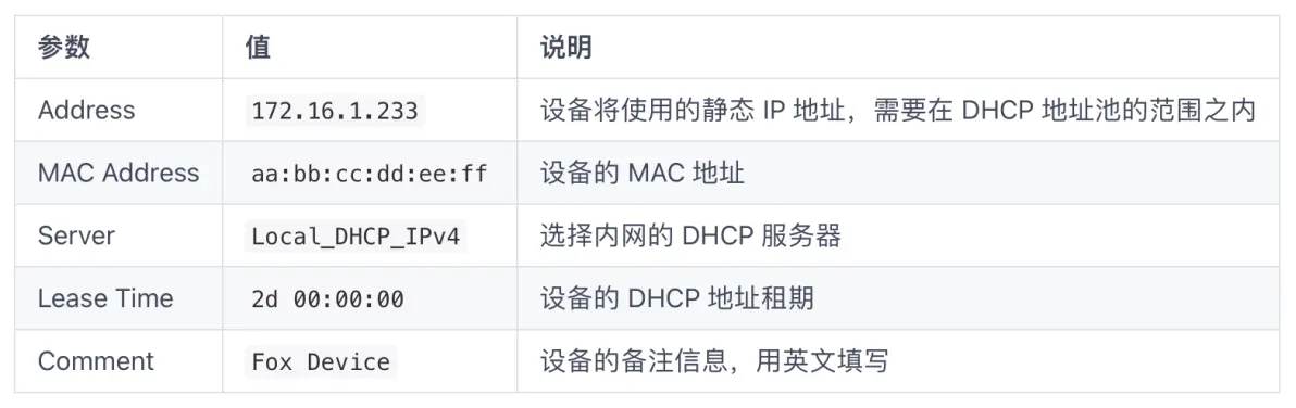 点击 按钮后,该设备的静态 IP 地址设置完成,让设备重新联网即可获取指定的 IP 地址。