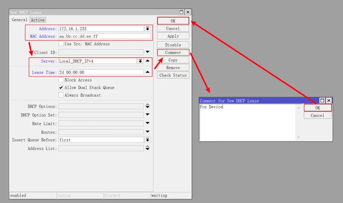 切换到 选项卡,点击“添加”按钮,新增一个 DHCP 静态地址: