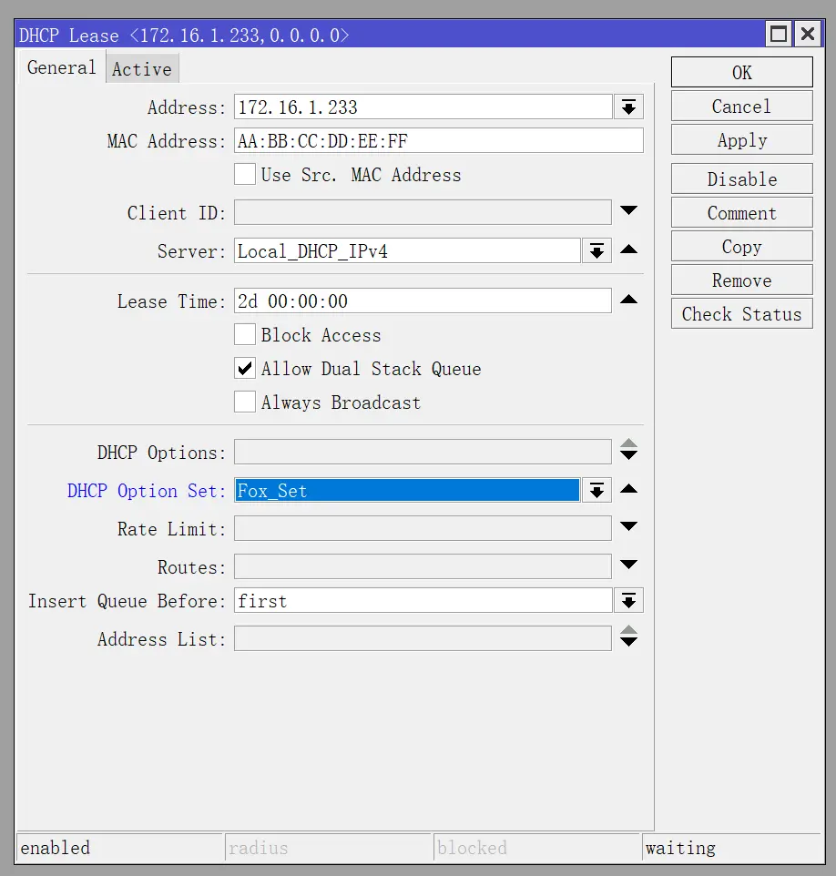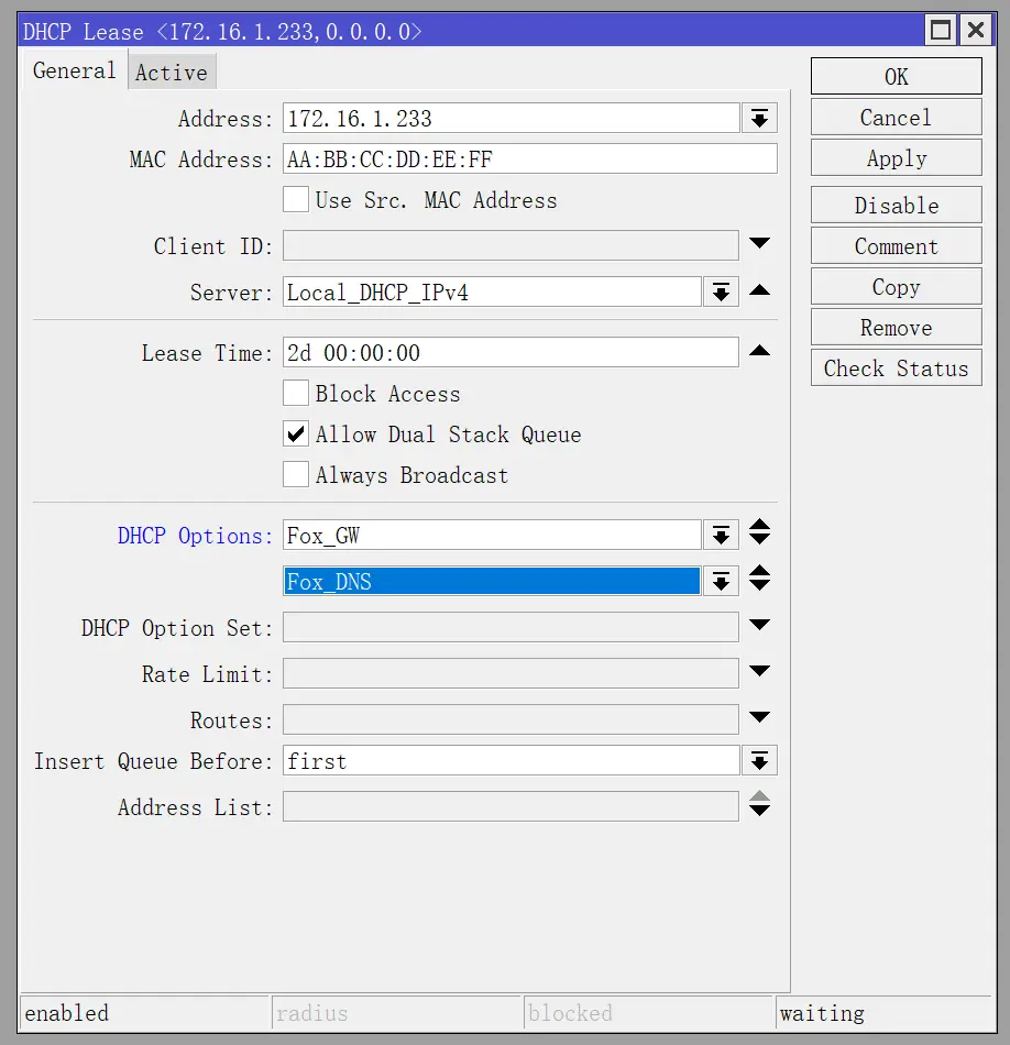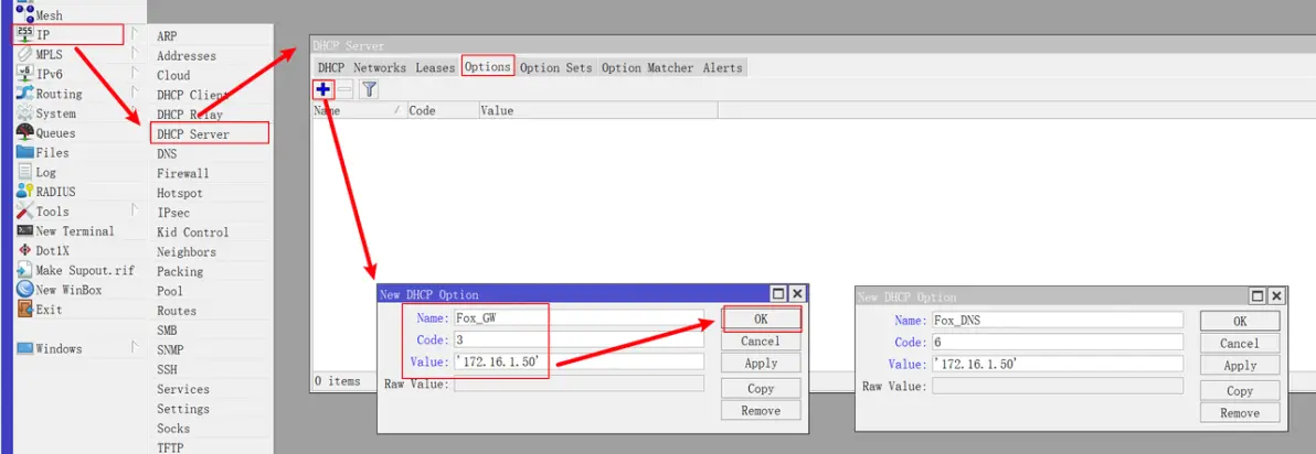 通过设置 DHCP 的 参数,可以让内网设备从 RouterOS 的 DHCP 服务器获取指定的 和 。